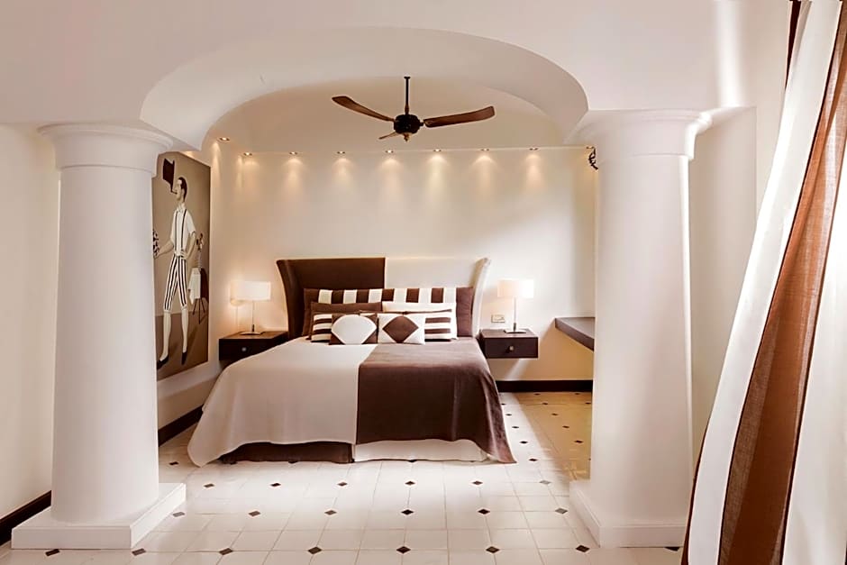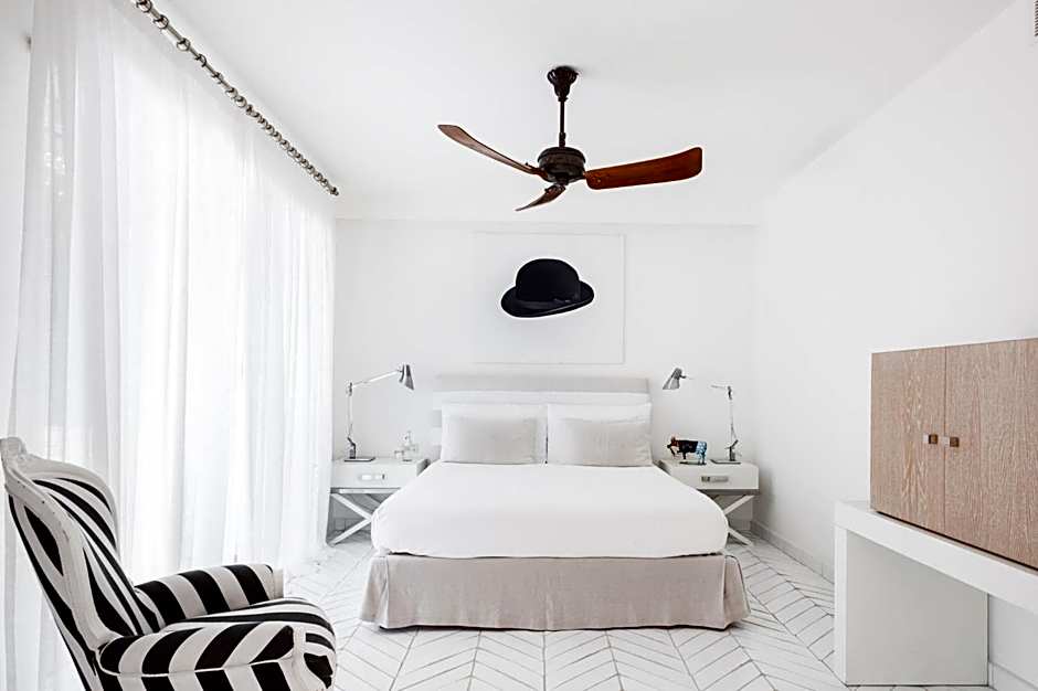 Offering panoramic sea views, this spacious suite features contemporary art paintings, a large living space and white stone floors. The bathroom, with limestone marble, is complete with a double sink, bath and shower.